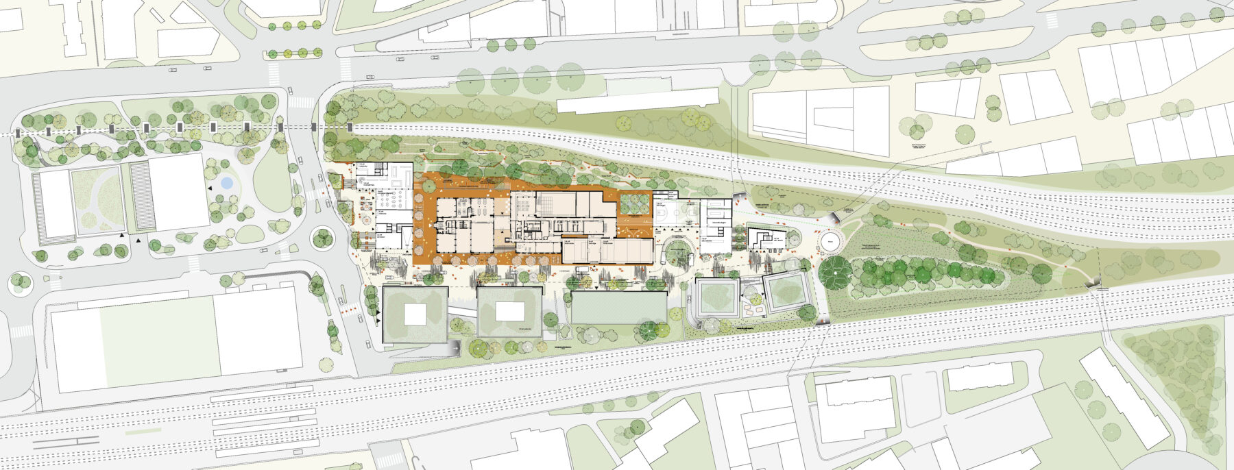The urban planning organization continues the characteristic of the organically grown factory. A gradient is applied here from an urban feeling to the connection with the surrounding neighborhoods. The carefully placed volumes create a sequence of public space, places, and squares for various target groups, designed from a human scale, experience and quality of stay.