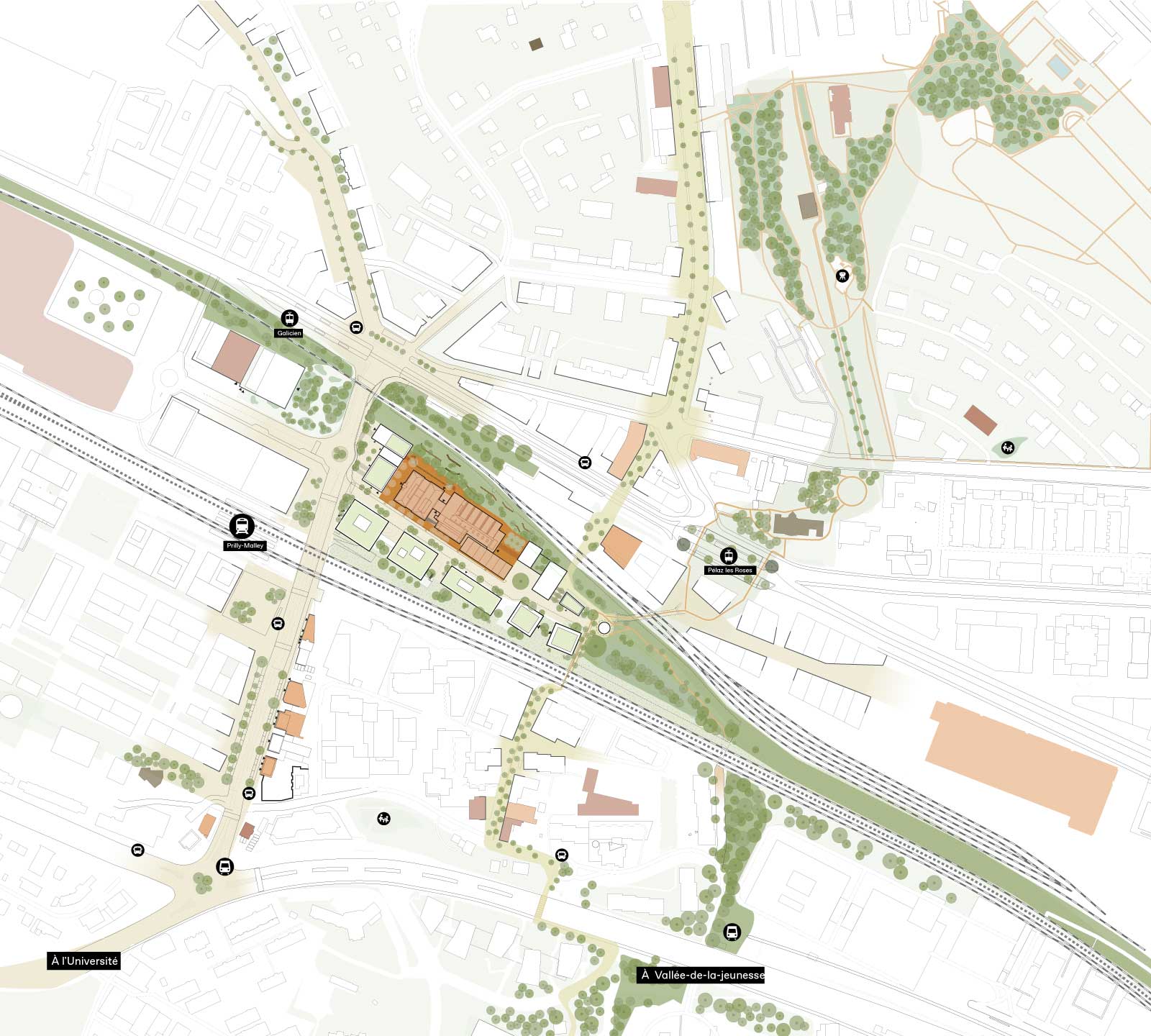 The wish for an ecological (compensatory) landscape to the east of the plan area is an inspiration and a breeding ground for seeing the entire area and designing it as an eco-district. The landscape qualities of the ecozone continues in the north and south sides of the site. In the newly designed Rue du Grand-Pré, the flowery and dry meadows (des prés fleuris et sèches) on the south side and the park-like shrubland landscape on the north side meet and form a coherent whole where the landscape and the city have a playful encounter .