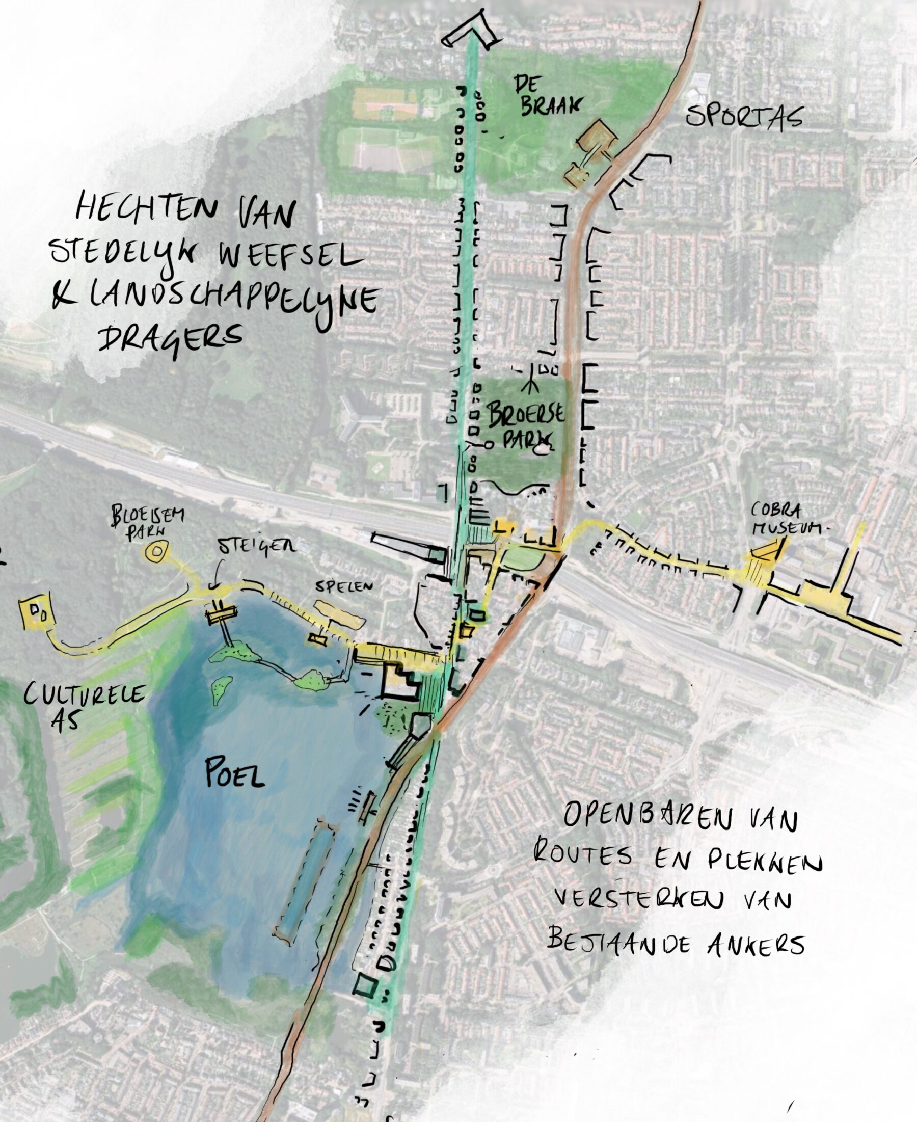 The A9 is currently being widened and covered in three locations to unify Amstelveen as a city and overcome the barrier of the motorway. This presents a unique opportunity to integrate the distinctive, intimate atmosphere and identity of the old village on both sides of the highway. The public space will play a central role in the design strategy, enhancing the connection and synergy between the Northern Riverbank, the Amsterdamse Bos, the Old Village, and the surrounding neighborhoods, while providing a quality boost to the entire area.