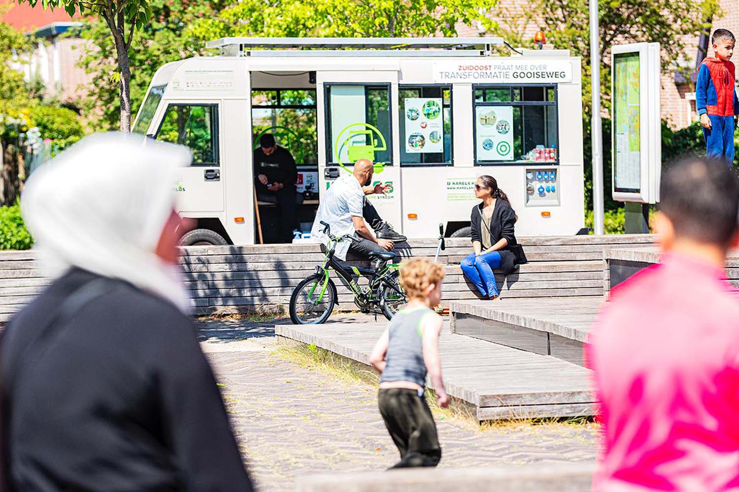 We disconnect the motorway (A10) from the Gooiseweg to minimise vehicle traffic, creating space to play and work within the city, and providing space for social interaction. We vary using wide and small spaces resulting in a pleasant alternation that ties in with parks and green structures. In doing so, we also resonate with the existing adjacent residential area and redefine its appearance. In the new residential area, the Gooiseweg will no longer form a barrier but becomes a connective park filled with urban functions and sustainable accessibility. Each space will have its unique function matching the appearance and theme of the surrounding neighbourhoods, based on the needs of the current residents. Combined, it forms a meaningful landscape where food cultivation, sports, outdoor play and circularity fuse into a robust, green public space.