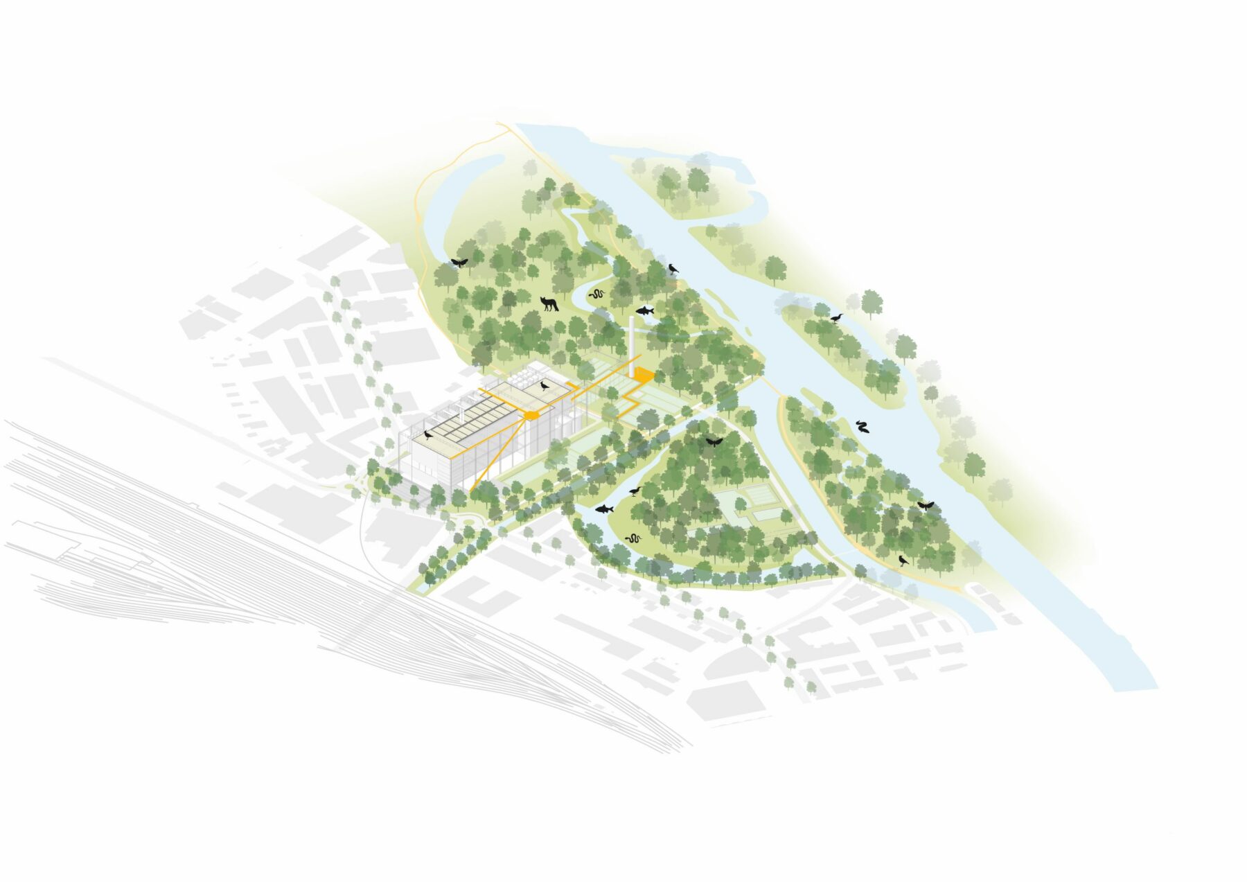The new power plant building has been placed as far away from the Reppisch as possible to create a wide and generous profile with gentle ecological banks along the creek. The programme of the ‘Antoniloch’, an old meander where the current wastewater treatment plant is located in the middle, will be reduced to make room for the unique high-dynamic character of the river biotope.