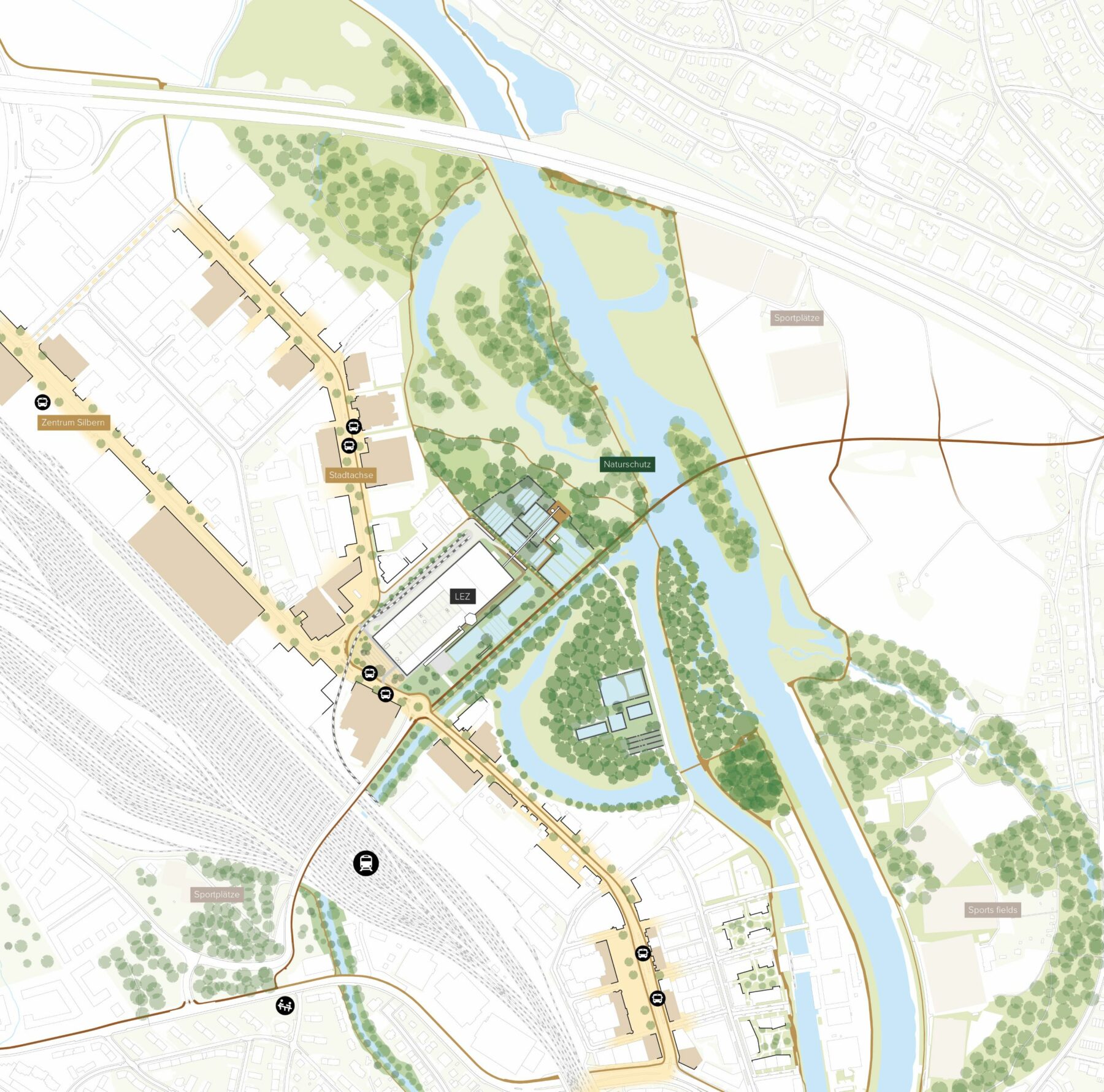 The whole is carefully intertwined with its surroundings in several ways. The zone along the Limmat and the Reppisch forms the basis for a solid ecological and recreational connection. The complex itself is connected to sustainable mobility: its own branch line to the railway. In addition, the power plant forms the basis of a smart grid for the immediate surroundings.