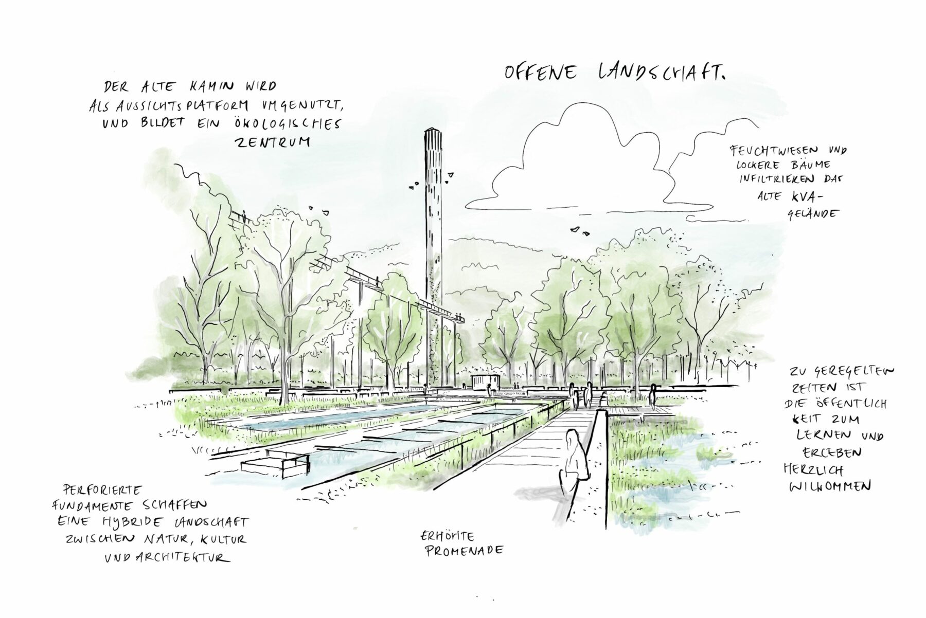 A good connection is made to a network of pedestrian connections along both the Limmat and the Reppisch. The route along the Reppisch now has limited sojourn quality and is therefore not very attractive. The plan shows that the expedition route parallel to the stream will disappear. The new, car-free profile − with a through-route for cyclists that will eventually cross the Limmat by means of a bridge − contributes significantly to the design’s new, pubic-friendly character. Recreational areas linked to this route have been created next to the power station, which also interacts with the building via a partly publicly accessible pre-use programme. The centre will thus have an open view on that side. Also on that side, a long staircase will provide access to the roof of the power plant. A footbridge leads to the old chimney, which will be transformed into a panoramic lookout point over the river, 65 metres high. Lake Zurich (12.5 km away) will be clearly visible in clear weather.