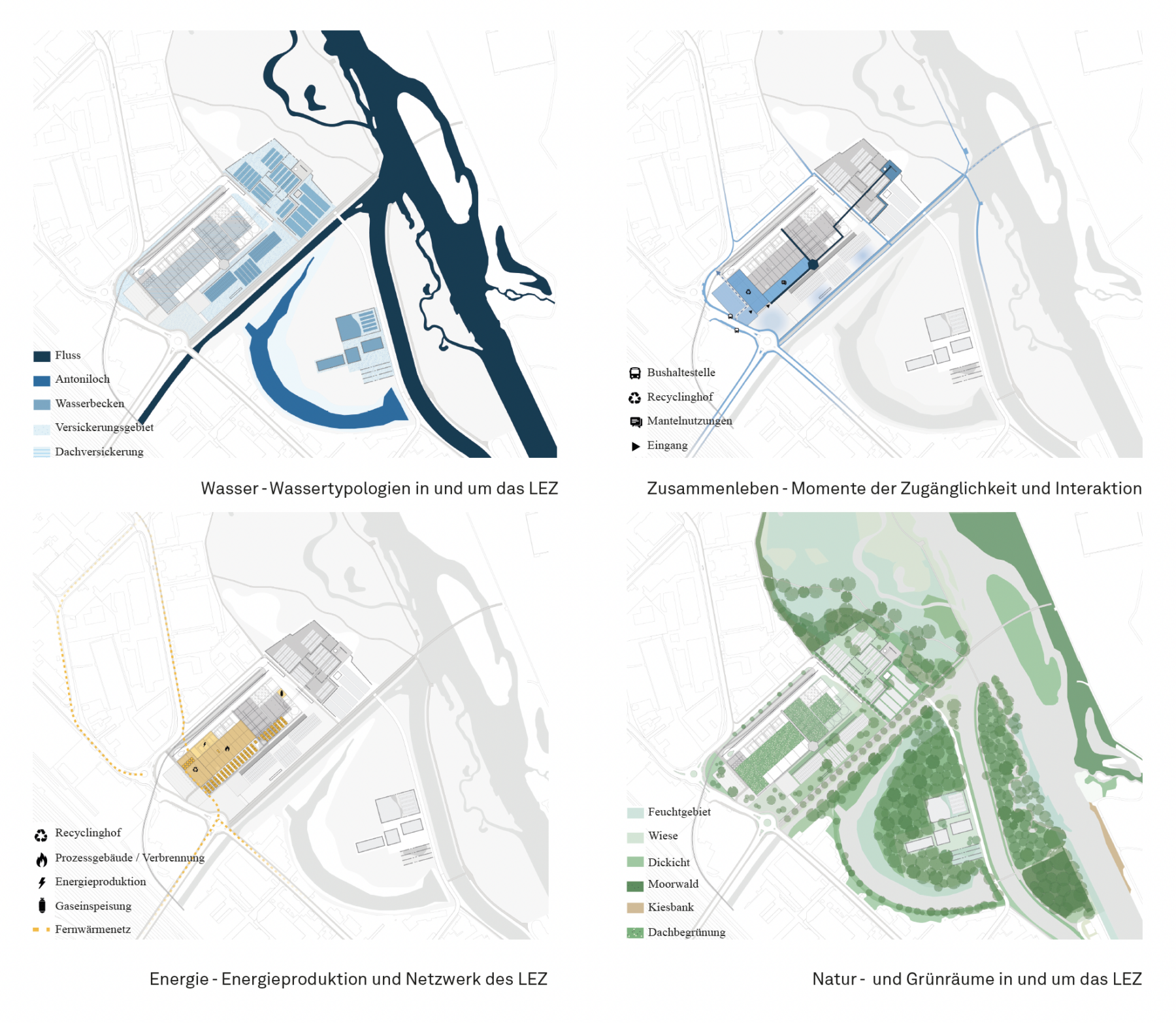 The new power plant building has been placed as far away from the Reppisch as possible to create a wide and generous profile with gentle ecological banks along the creek. The programme of the ‘Antoniloch’, an old meander where the current wastewater treatment plant is located in the middle, will be reduced to make room for the unique high-dynamic character of the river biotope.