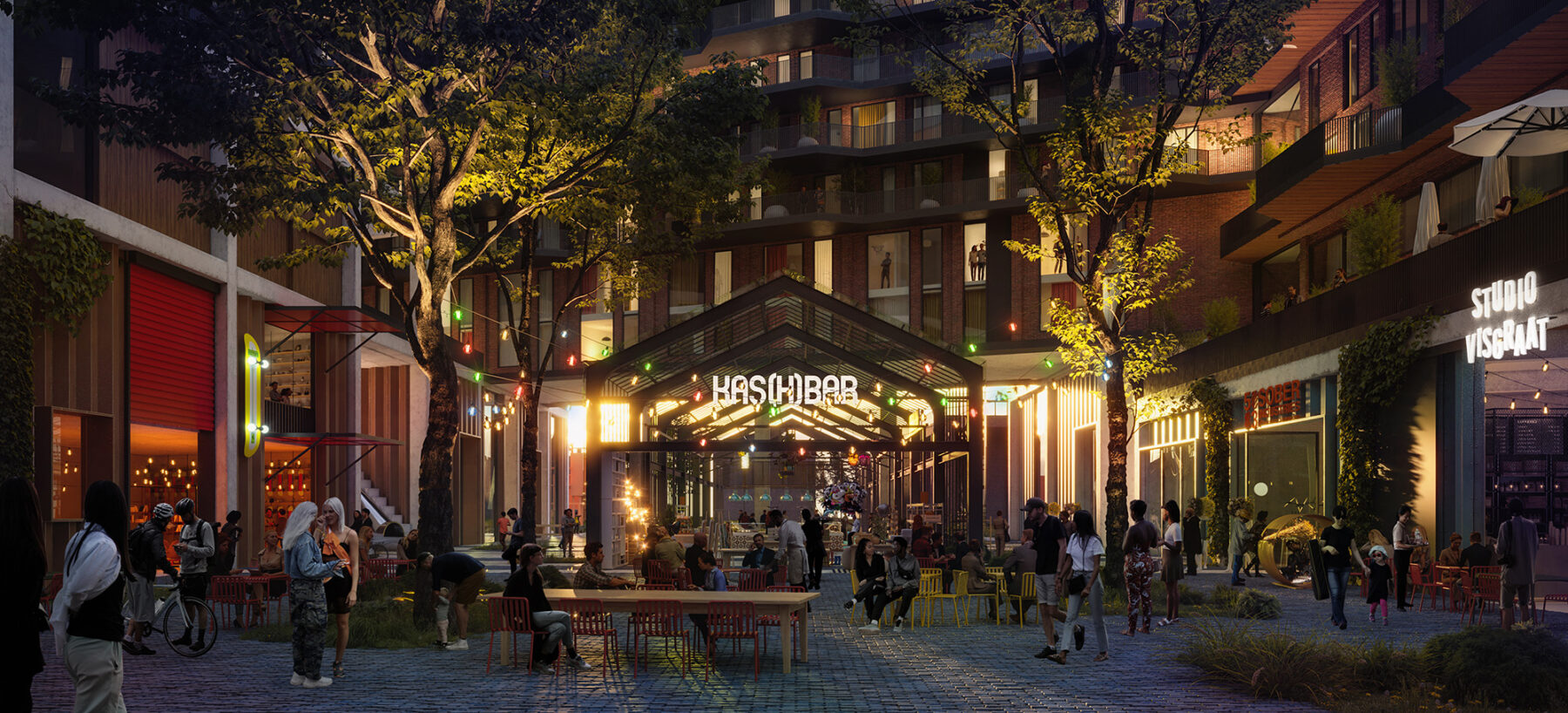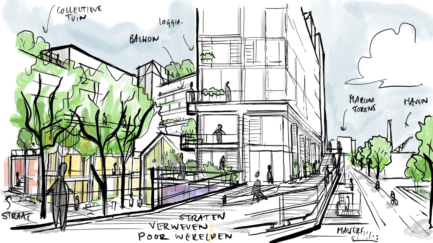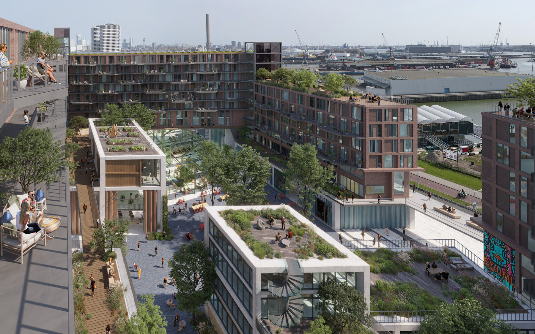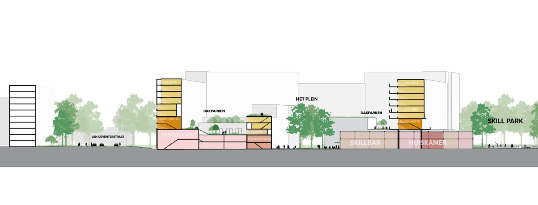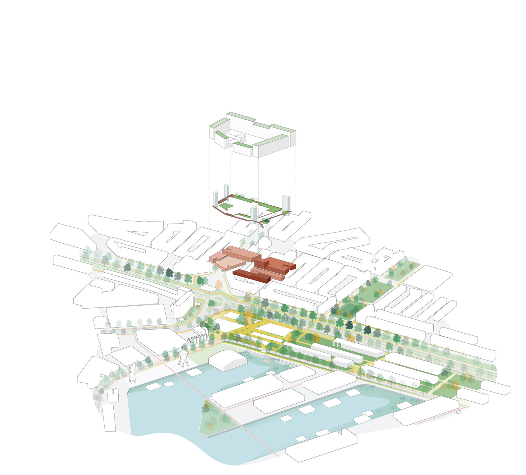 Skill City allows us to turn a harbour workshop into a town with elevated residential neighbourhoods that are affordable, intertwined by a spectacle of alleyways, stairs, elevated streets, rooftop gardens, squares and bold indoor and outdoor spaces. In the plan, we maximise the experiential value and interaction between living, working and learning inside the building. On a scale-level, this building blends in with the surrounding buildings perfectly.