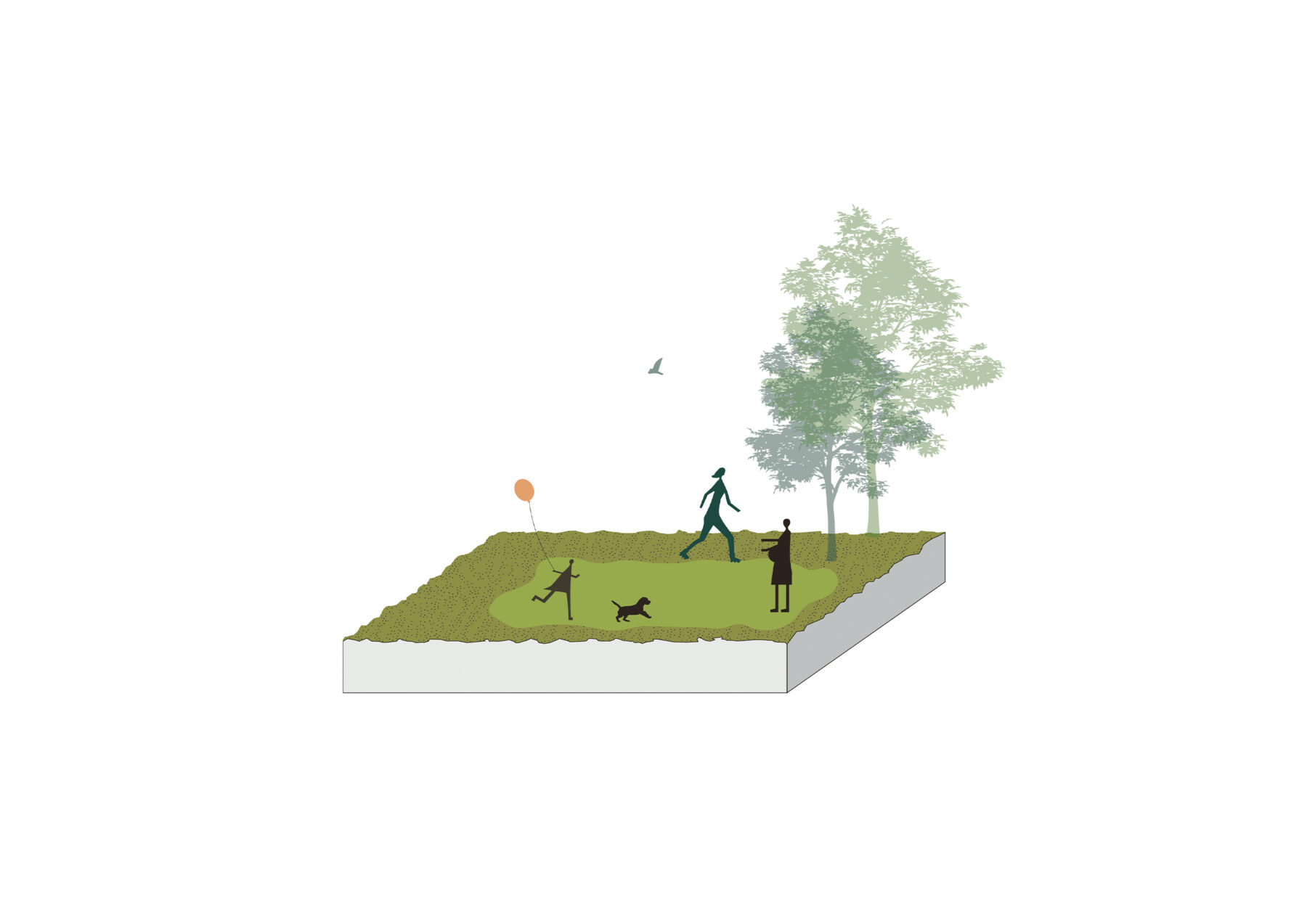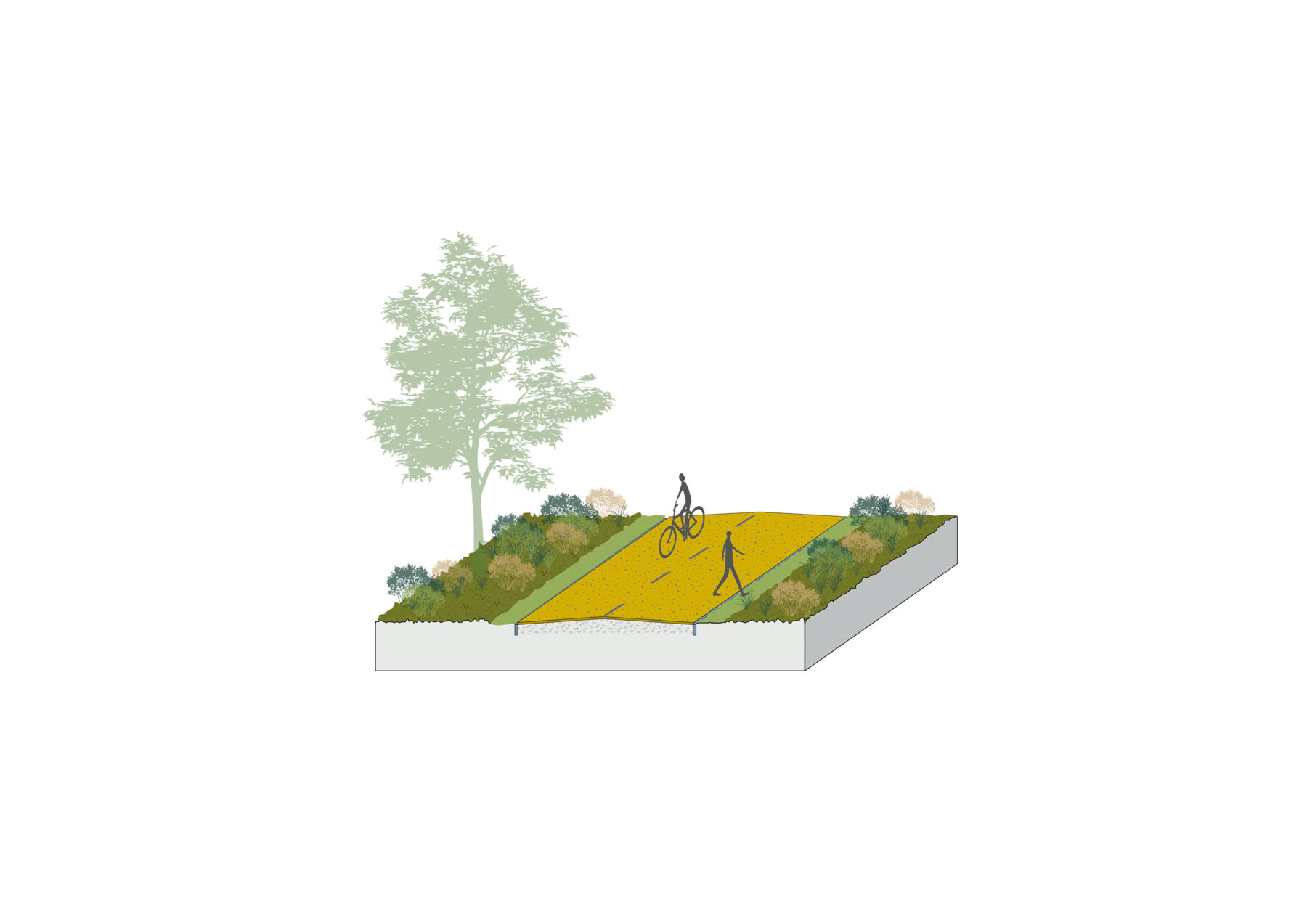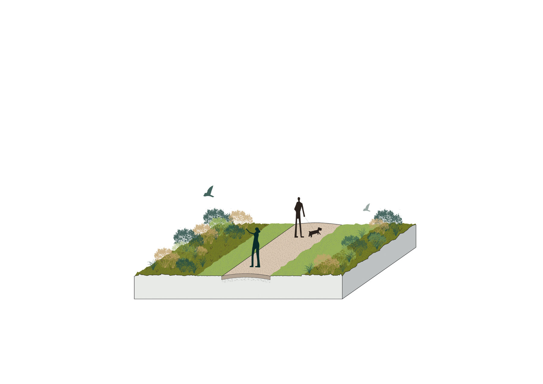 In the landscape, variation is sought in different identities. By working with local species, the park builds on the qualities of the surroundings. Natural banks and denser bushes contribute to the ecological value of the green area. Paving will be kept to a minimum. De Slinger, a shared-space route connecting the sports park to the village, runs through the entire area. Informal meandering paths run between the greenery to the neighbourhood. Closer to the houses are an informal yard and a neighbourhood garden where residents can meet and children can play safely.