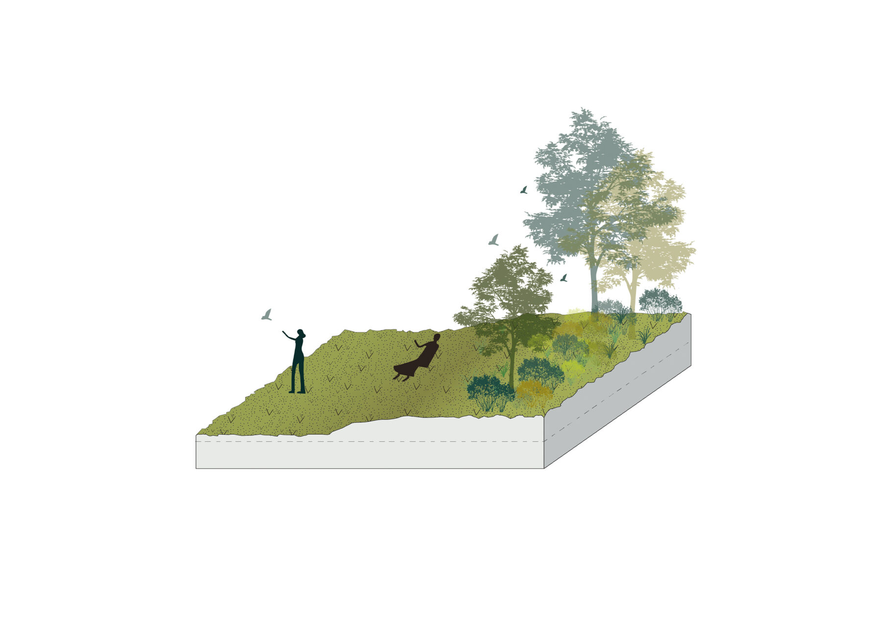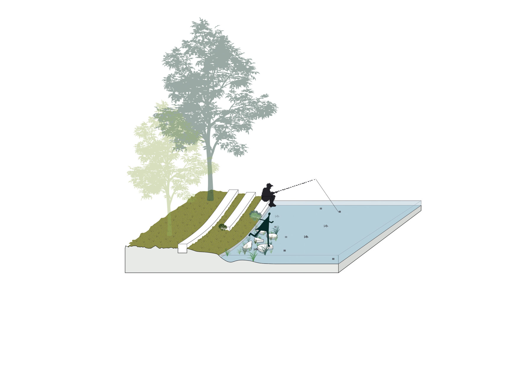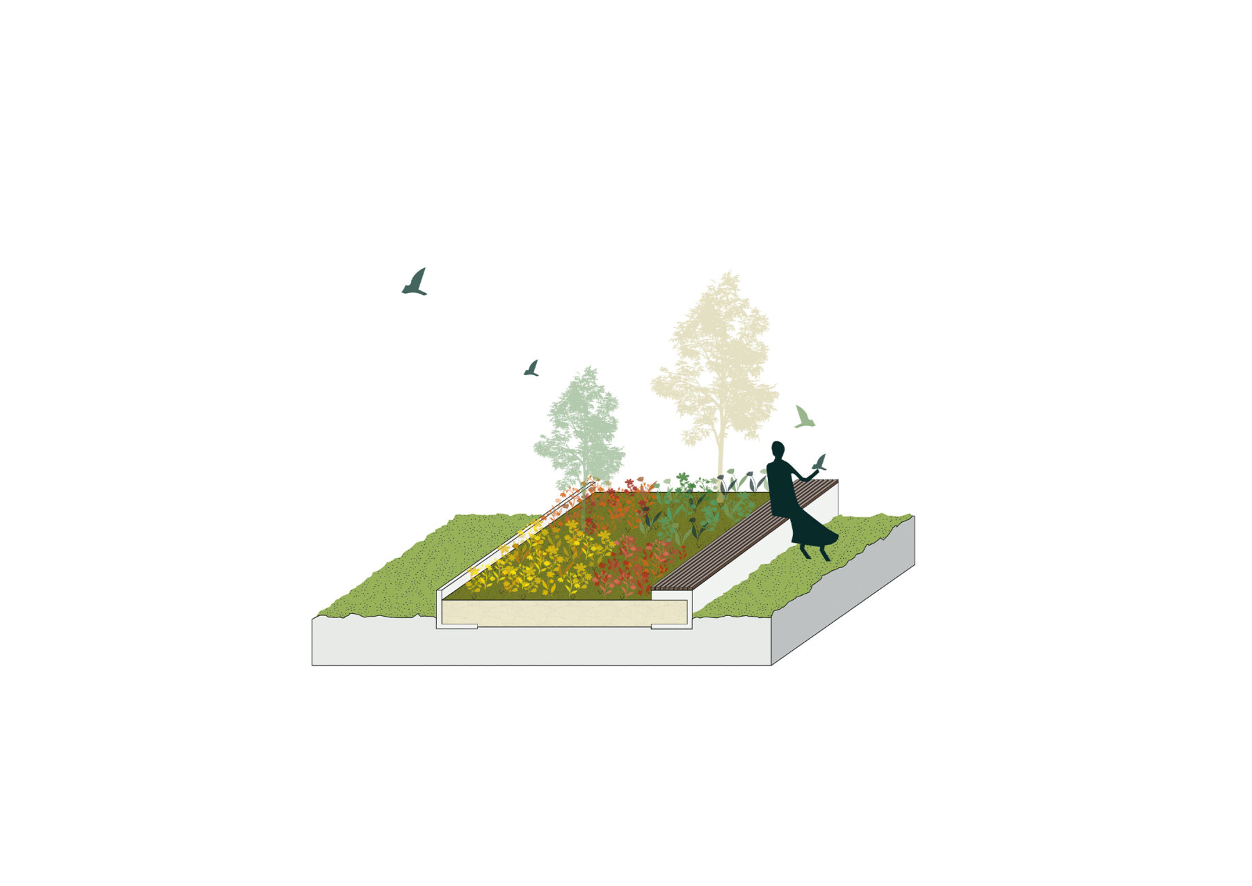 In the landscape, variation is sought in different identities. By working with local species, the park builds on the qualities of the surroundings. Natural banks and denser bushes contribute to the ecological value of the green area. Paving will be kept to a minimum. De Slinger, a shared-space route connecting the sports park to the village, runs through the entire area. Informal meandering paths run between the greenery to the neighbourhood. Closer to the houses are an informal yard and a neighbourhood garden where residents can meet and children can play safely.
