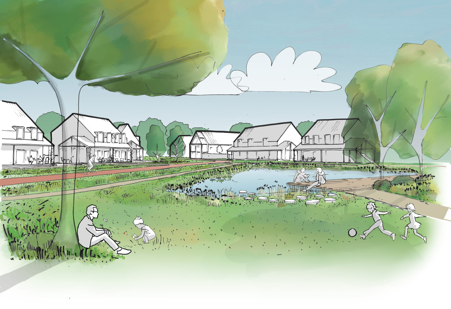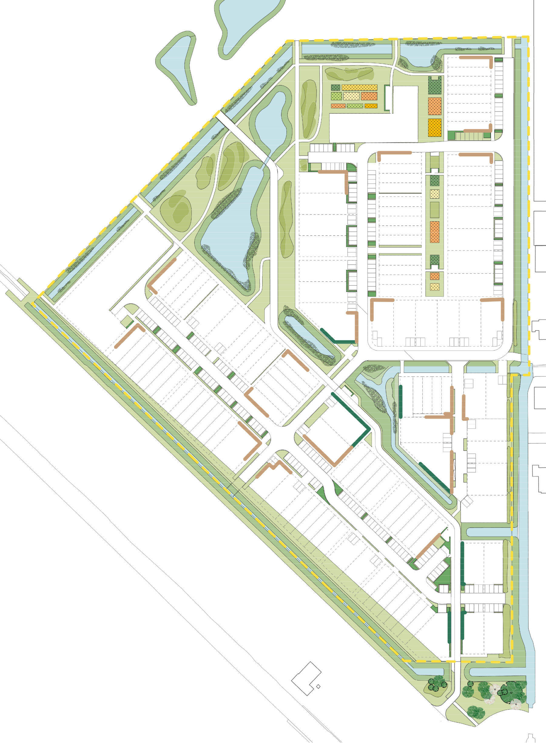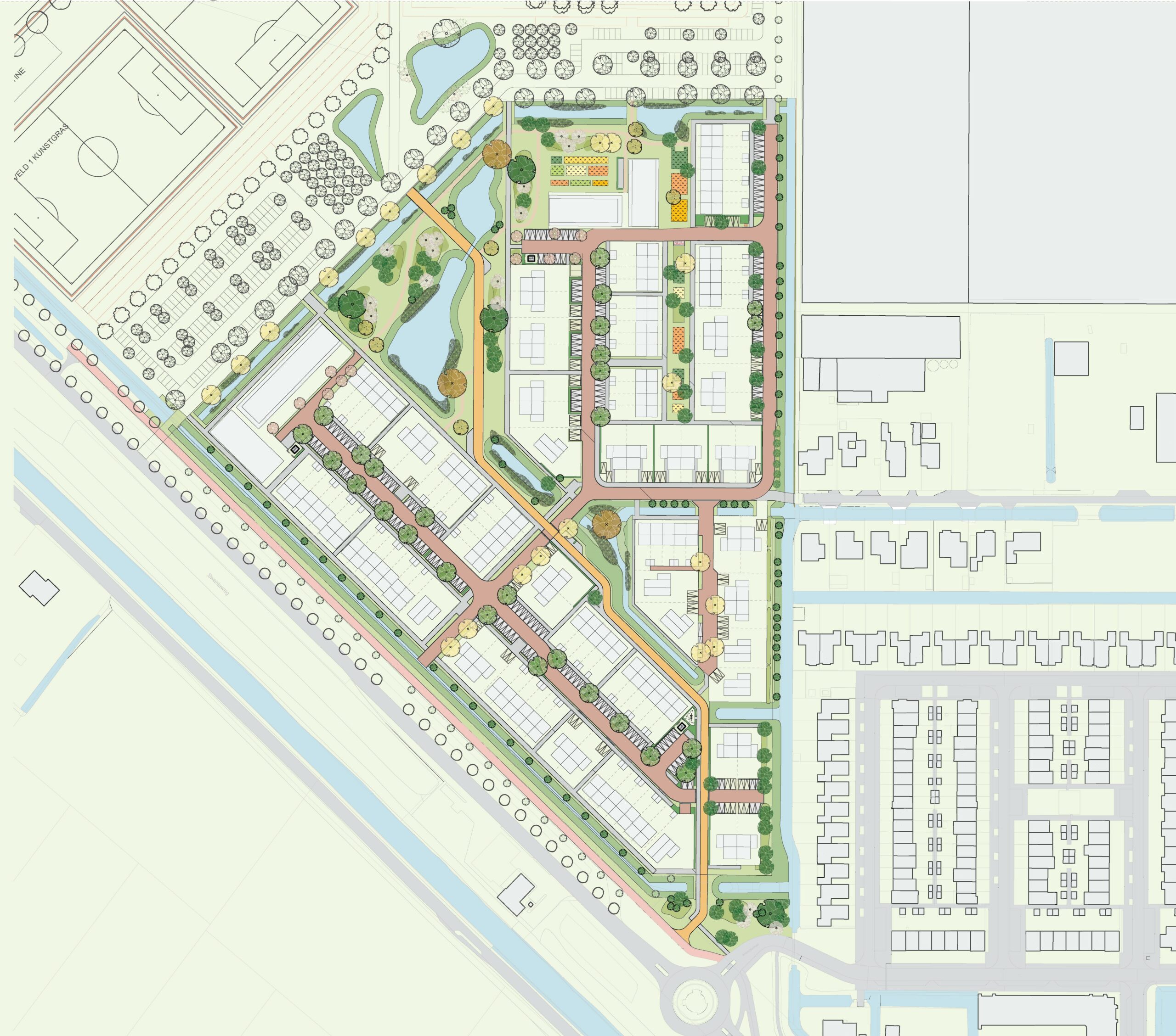 Our plan gives the northern village edge of Zevenhuizen in the Zuidplaspolder an attractive appearance and makes a gentle transition to the open polder. The neighbourhood opens up to the surrounding landscape with a central, wedge-shaped public park offering space for sports and games. The residential neighbourhoods and sports fields surround this as rooms. The area, once intended as an expansion site for greenhouses, will receive a quality boost from which the whole of Zevenhuizen will benefit with the housing and public green spaces.
