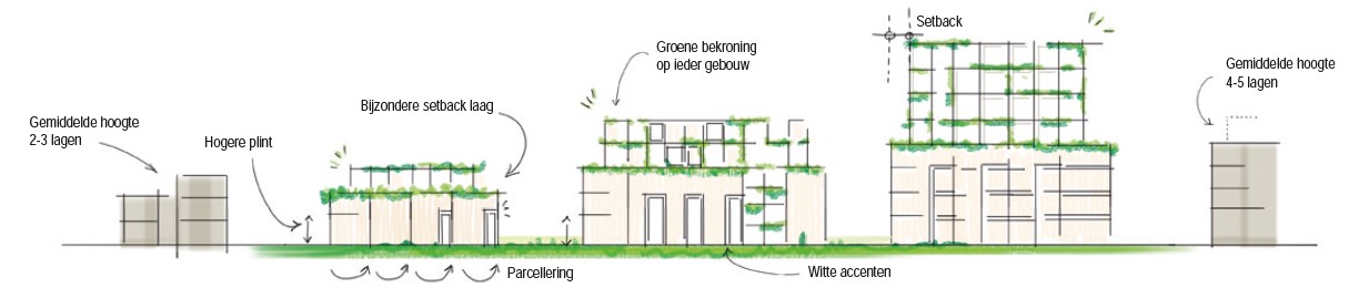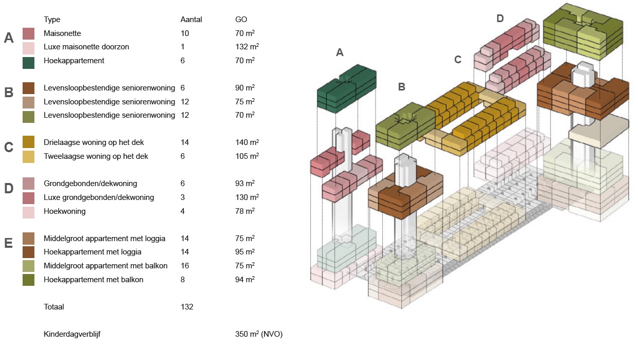 Building masses A, B, C, and D occupy the spatial system that presents itself from the Gerbrandystraat side: they exhibit a clear relationship in size, scale and height with the surrounding buildings. The building masses are designed all-sided to encourage the use of public space and ensure safety. The volumes have flat roofs, in keeping with the typical style of post-war reconstruction.