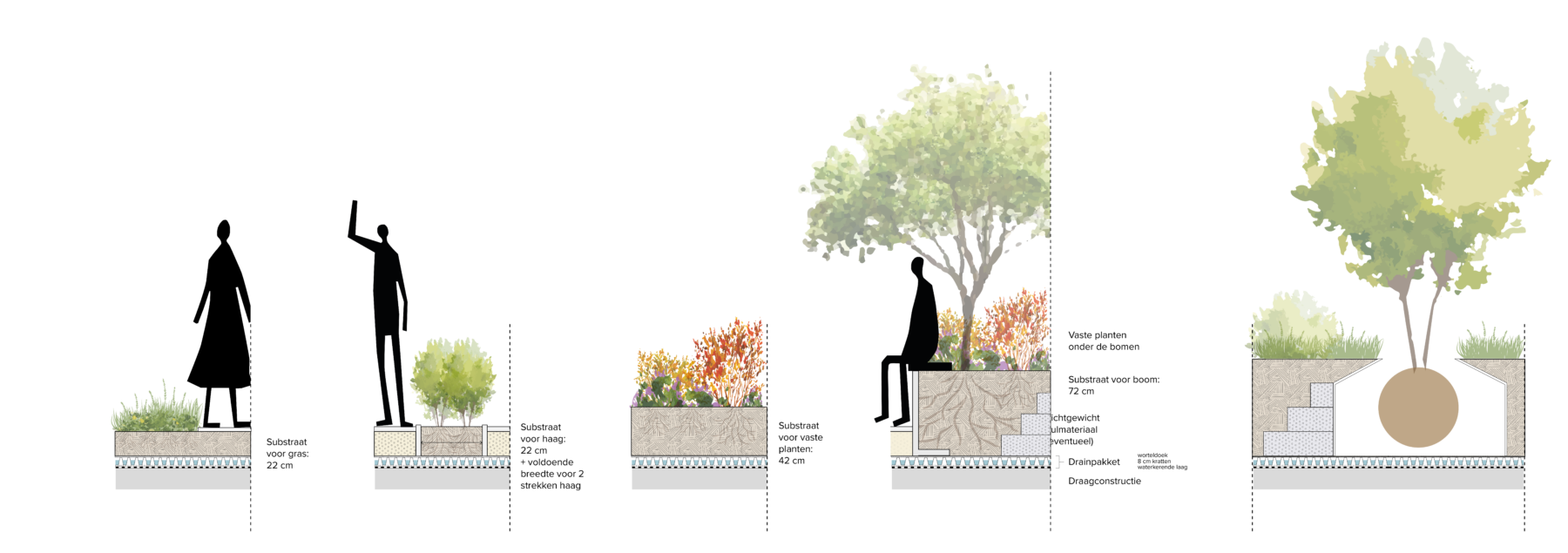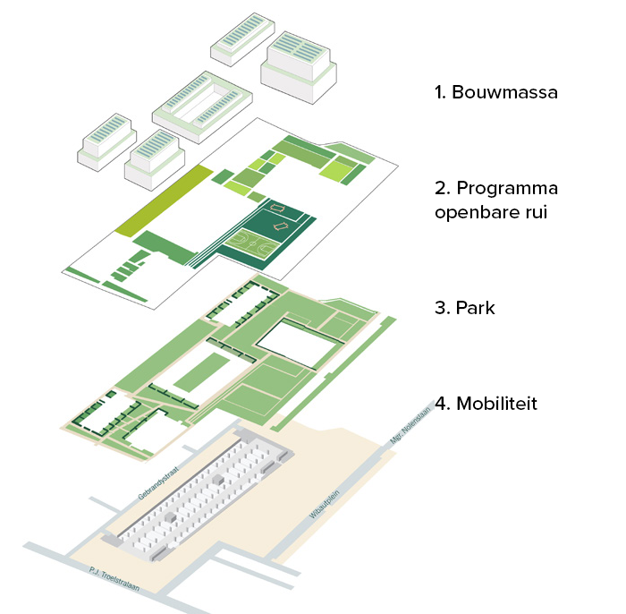 A strong mix of typologies, evenly distributed across the blocks, will also attract a mix of residents. Combined with the attractive public space, this composition will help cultivate an area where people almost naturally keep an eye out for each other. The new terraced landscape is the result of an underground parking facility. The slope gradient has been kept to a minimum to allow wheelchair users and those with reduced mobility unimpeded access to the park. The fact that the park is visually at the same level as the rest of the neighbourhood contributes to an inclusive atmosphere.