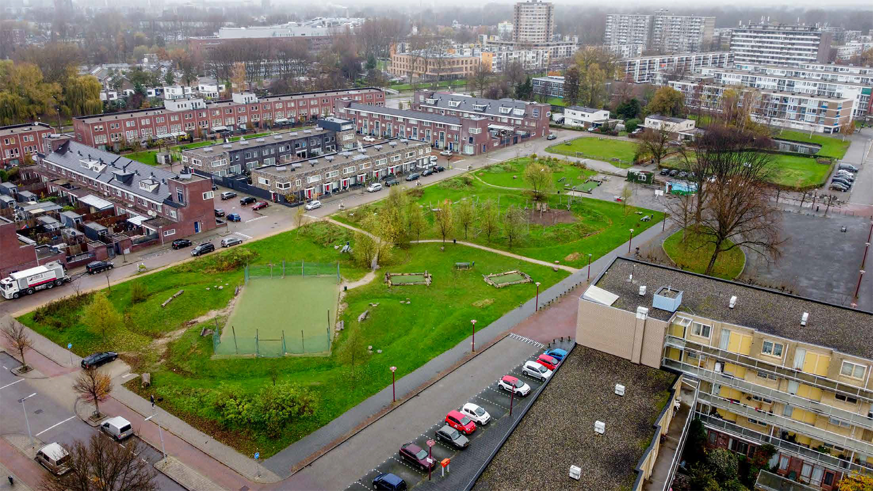 The WIJpark will serve as a connecting link on various levels: urban, landscape and ecological. From an urban planning point of view, we make the connection by letting the buildings resonate with the context in terms of height and size. To this end, the relationship between the new buildings and the existing tract construction is key. The Monseigneur Nolenslaan is spanned, as it were, between two anchors: the existing facilities along Monseigneur Nolenslaan and the WIJpark. The WIJpark provides the young and the old space for leisure, sports and playing. The square has an open and accessible set-up with various sports and playing facilities to stimulate individual or team activities. That makes it a counterbalance to Monseigneur Nolenslaan, which focuses on catering and retail.