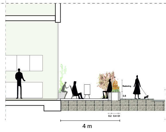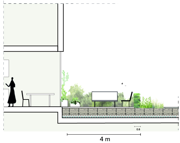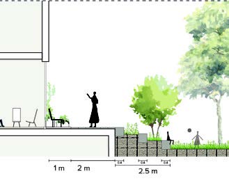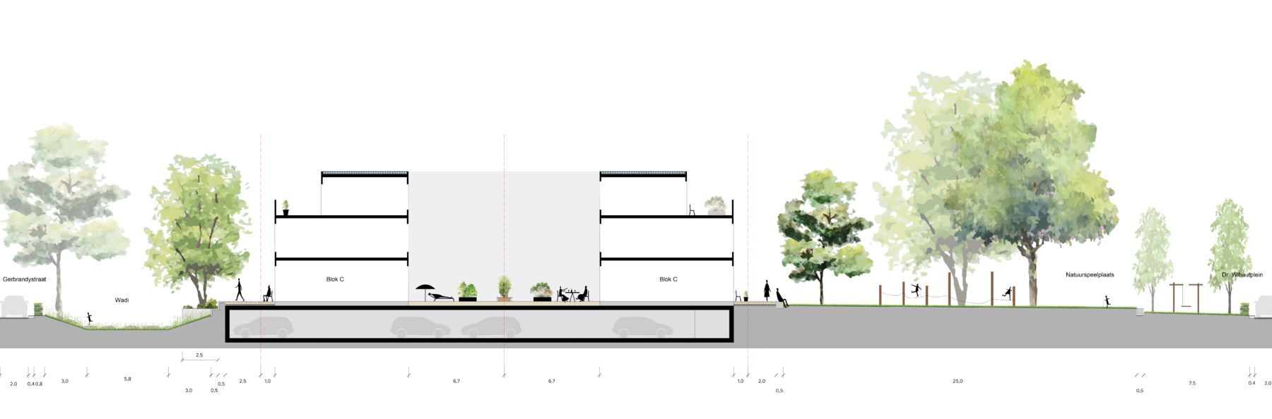 A strong mix of typologies, evenly distributed across the blocks, will also attract a mix of residents. Combined with the attractive public space, this composition will help cultivate an area where people almost naturally keep an eye out for each other. The new terraced landscape is the result of an underground parking facility. The slope gradient has been kept to a minimum to allow wheelchair users and those with reduced mobility unimpeded access to the park. The fact that the park is visually at the same level as the rest of the neighbourhood contributes to an inclusive atmosphere.
