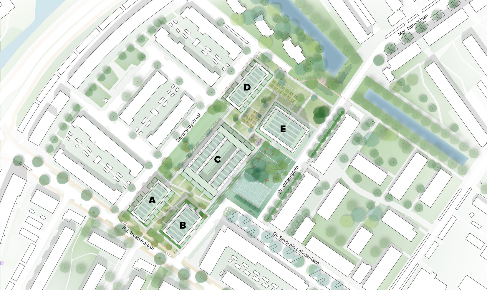 Building masses A, B, C, and D occupy the spatial system that presents itself from the Gerbrandystraat side: they exhibit a clear relationship in size, scale and height with the surrounding buildings. The building masses are designed all-sided to encourage the use of public space and ensure safety. The volumes have flat roofs, in keeping with the typical style of post-war reconstruction.