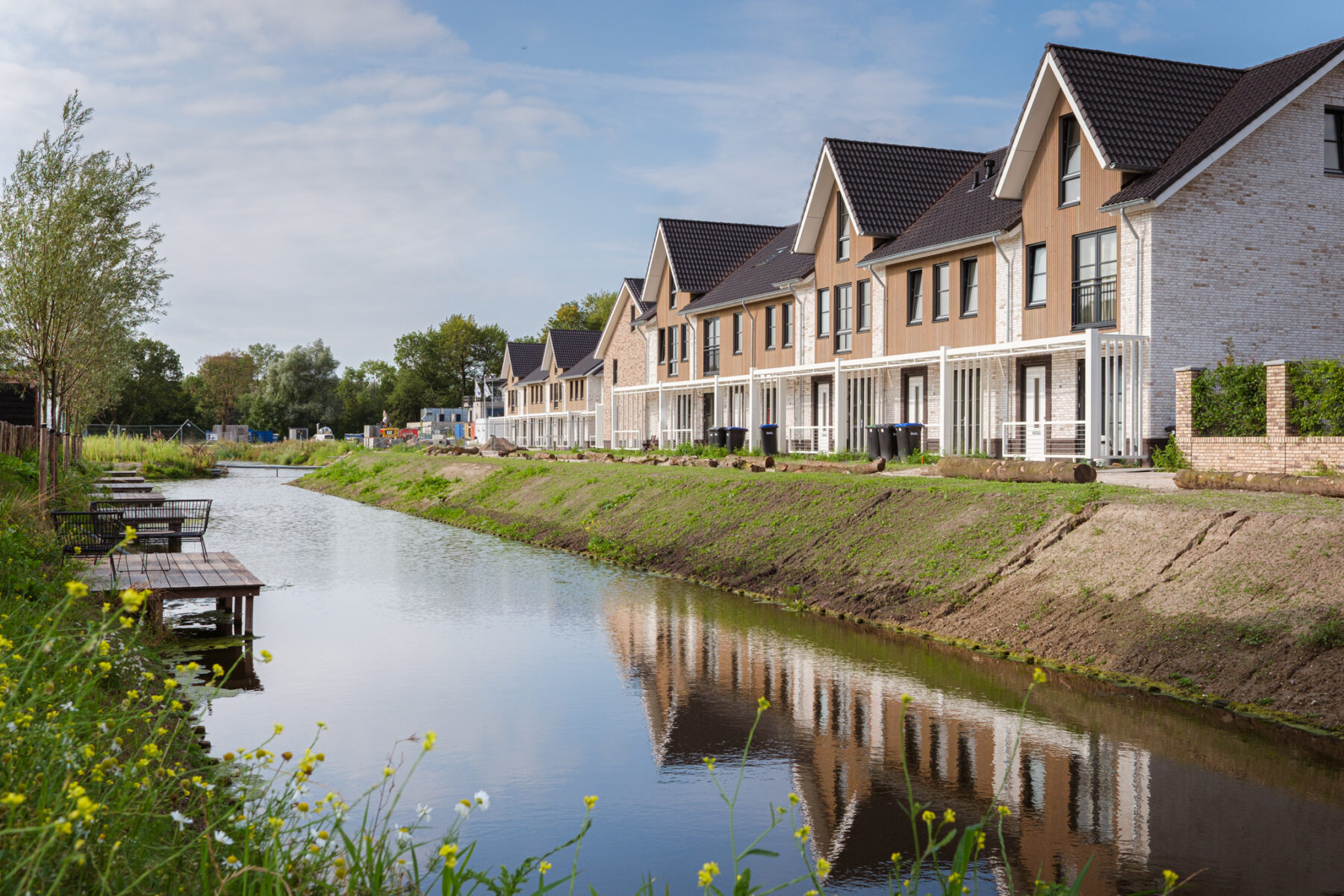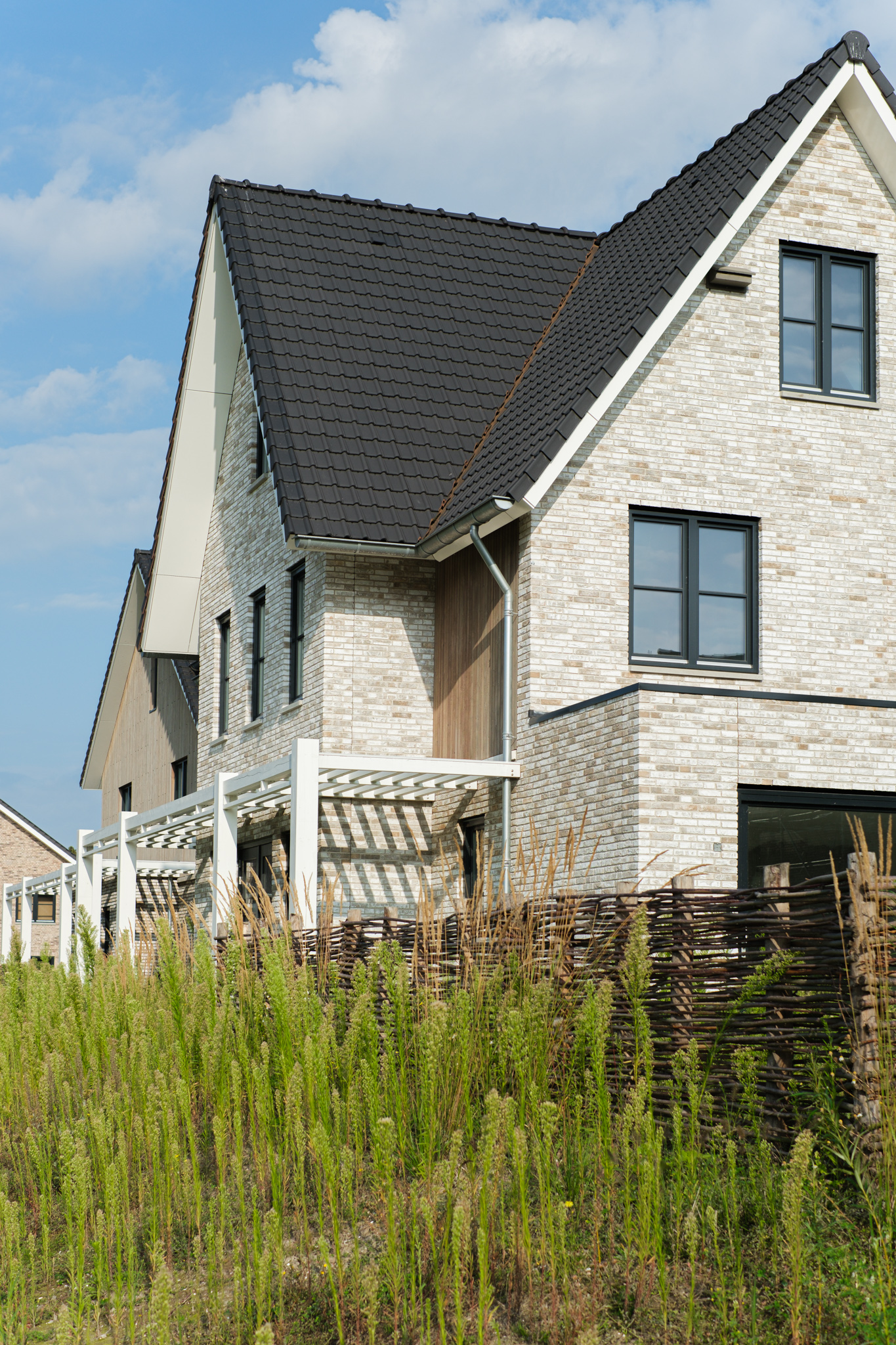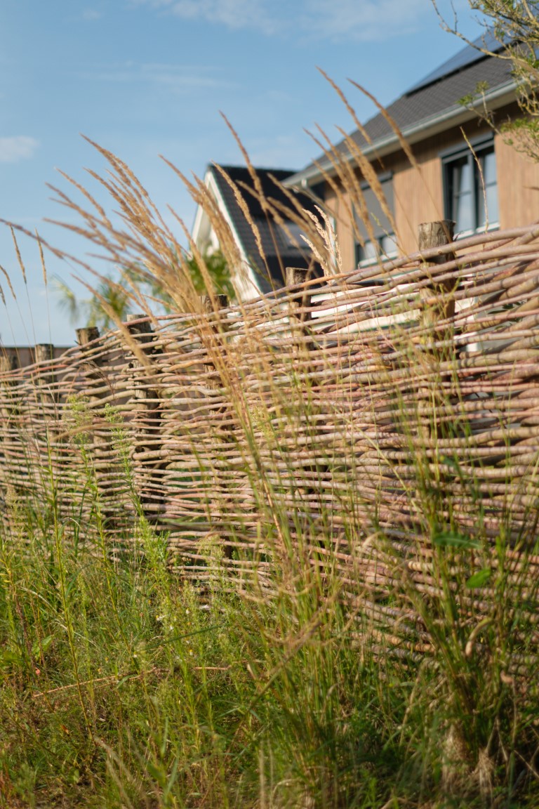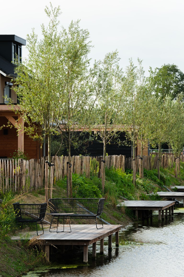 Het park is nog niet aangelegd, maar de tuinen en overgangen naar het openbare gebied al wel. Daar zie je goed hoe de zorgvuldig uitgekozen beplantingstypes en vormgegeven hekwerken direct een bepaalde kwaliteit aan de plek toevoegen. Het gevlochten wilgenscherm met siergrassen ervoor geeft privacy maar oogt tegelijk natuurlijk. De tuinen aan de oever zijn ingericht met een schapenhekje, knotwilgen en vlonders aan het water. En aan de straten beginnen de lage hagen van Hemelse bamboe te groeien.