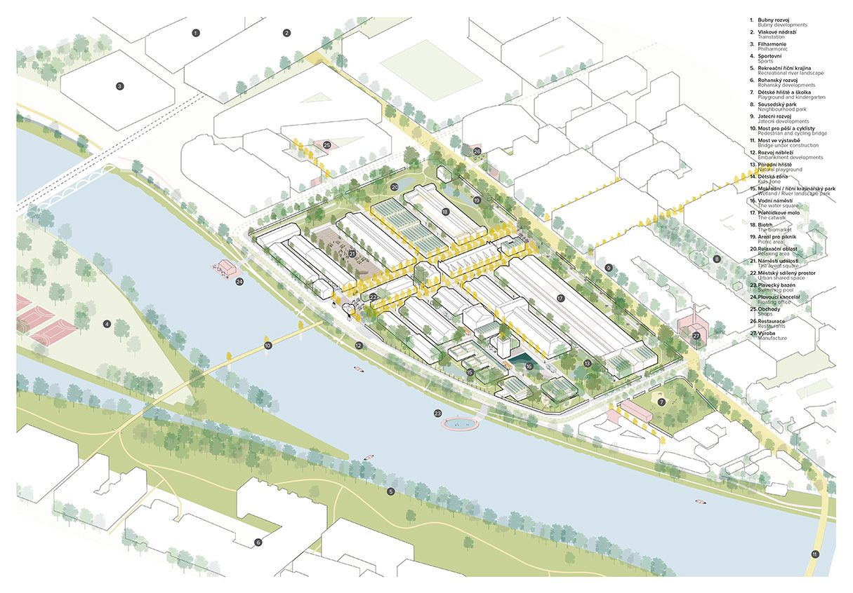 Het project is uniek vanwege zijn gevoeligheid. De oude slachthuismarkten aan de Moldau-rivier zijn meer dan 100 jaar oud en samen hebben ze de monumentenstatus. Sinds de sluiting van de slachthuizen zijn er bedrijven, winkels, restaurants en creatieve industrieën ingetrokken.