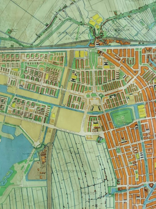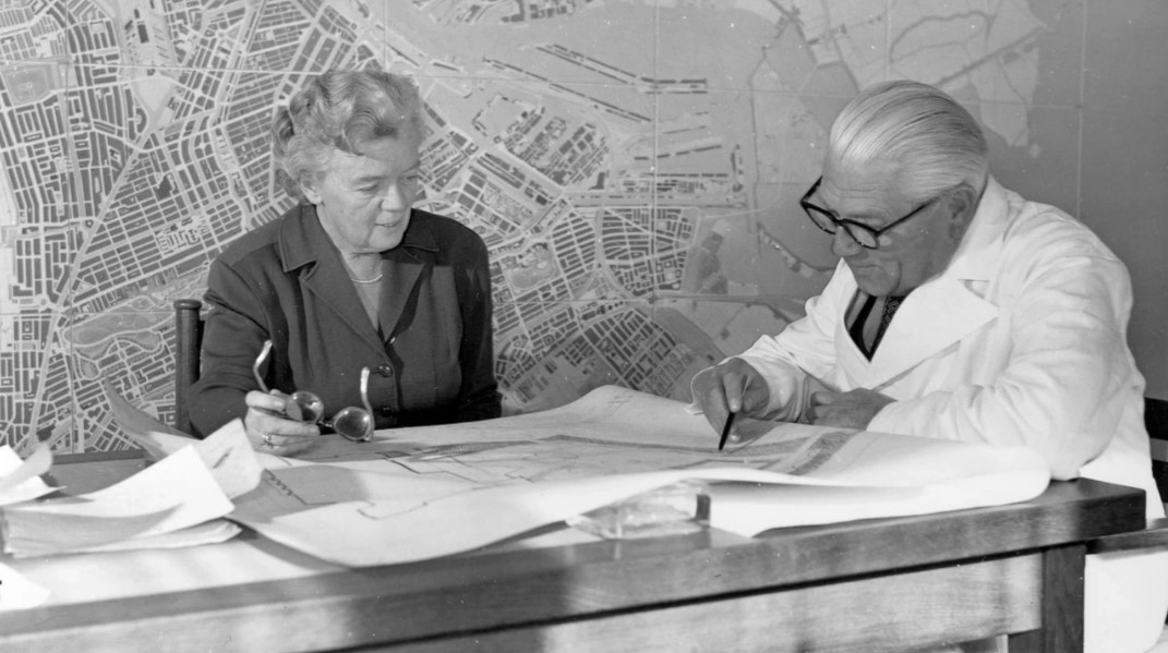 Toch biedt juist Van Eesteren ook inspiratie, vertelt Flora Nycolaas, hoofdontwerper stedenbouw bij de Gemeente Amsterdam. Als eerste lopen de lange lijnen van de stadsplattegrond in zijn uitbreidingen zoals Nieuw-West en Buitenveldert, helemaal door. Er zit een prachtige continuïteit in hoe je de stad langs deze wegen beleeft, door alle tijdslagen van de stedenbouw. Als tweede valt er iets bijzonders op aan zijn plankaarten. Waar sommige buurtjes heel precies zijn uitgetekend, is het ontwerp juist bij de ingewikkelde knopen leeg gehouden. ‘Daarmee biedt Van Eesteren ruimte om op die cruciale plekken, op het moment dat omliggende ontwikkelingen gebouwd worden, de puzzel op de juiste manier op te lossen.’