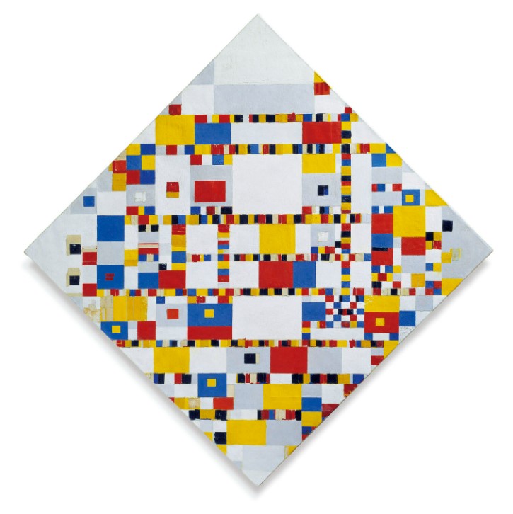 Toen Mondriaan in de jaren ’40 in Manhattan terecht kwam, vernieuwde hij zijn stijl. De grote kleurvlakken verfijnen zich, het harde zwart verdwijnt en de dikke lijnen vallen uiteen in vlakjes die zich moeiteloos in het geheel voegen. Volgens Daan geeft hij hiermee eigenlijk het ultieme antwoord op Van Eesteren. De gehechte stad is geen klassieke Mondriaan, maar een Victory Boogie-Woogie.