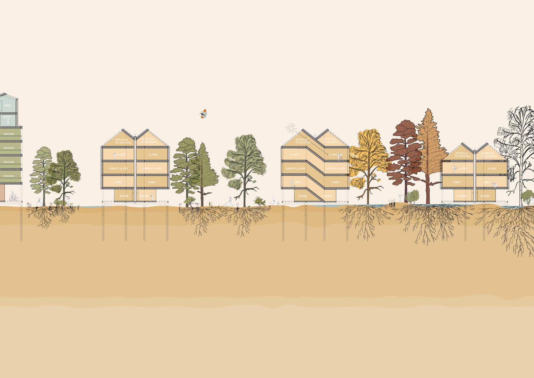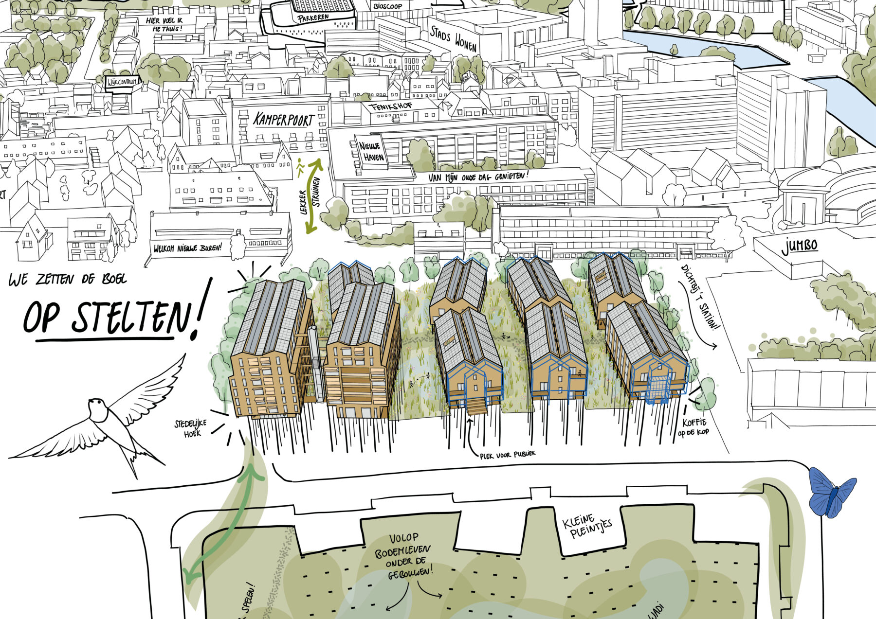 Samen met Dok architecten, La-di-da, Copper8 en Naturalis doen we mee aan de ontwerpprijsvraag biobased en natuurinclusief bouwen op de Nieuwe Veemarkt in Zwolle. Onze inzending "Op Stelten!" wordt nu (samen met de andere resultaten van de tweede ronde) tentoongesteld in de Elbertsschool.