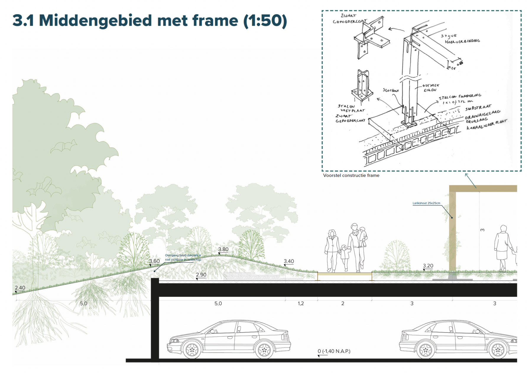 Onder het opgetilde landschap zijn 180 parkeerplaatsen gerealiseerd, het daklandschap bestaat uit een continue landschap met volle grond tot 80 cm en een retentie systeem van 10 cm waterbuffering en pomp irrigatie bij droogte. Op deze manier hebben we een project kunnen realiseren waar 87 bomen bijgeplant worden en 56 % van het plan groen en in (half) volle grond gerealiseerd wordt. We houden jullie graag op de hoogte tijdens de bouw en realisatie!