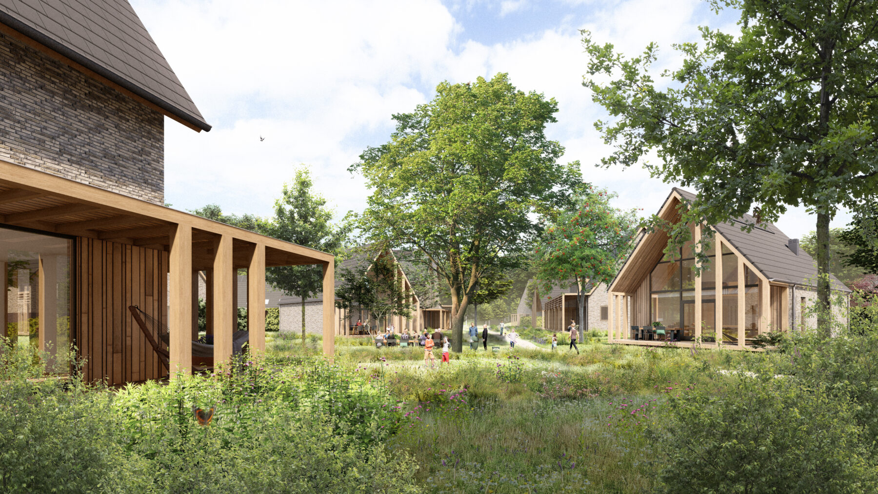 De basis van het plan wordt gevormd door de stevig beplante grondwal, die de locatie omsluit. Daarbinnen ontvouwt zich een licht glooiend, groen en autovrij landschap. Kleine buurtjes liggen als eilanden in een doorlopend parklandschap. Daarin is volop ruimte voor gezamenlijk gebruik voor spelen, ontmoeten en ontspannen. De auto is ‘verbannen’ naar de rand; een ringweg buiten de grondwal geeft toegang tot kleine parkeerkoffertjes aan de achterzijde van de woningen. Daarnaast zijn er twee grotere parkeervelden gemaakt aan de rand, voor bezoekers of de tweede auto. Deze liggen dus op grotere afstand van de woningen. Dit maakt het mogelijk om een unieke woonmilieu te maken waar avontuur en het buitenleven de boventoon voeren. Thema’s als natuurinclusiviteit en klimaatadaptatie krijgen daarmee de volle aandacht in het plan.