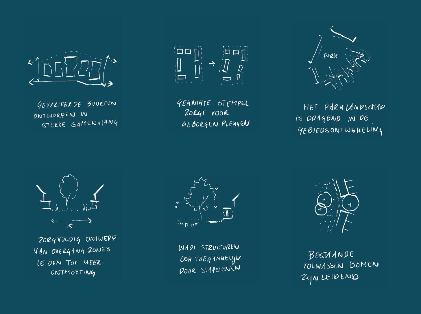 Het principe van de stempel uit de wederopbouwwijk heeft in dit plan een eigentijdse interpretatie gekregen. De randen zijn geknikt, zodat er omsloten plekken ontstaan, die de omwonenden een eigen, geborgen plek geeft die uitnodigt tot collectief gebruik. Het parkeren is binnen in de stempels, aan de achterzijde van de woningen opgelost. Daardoor zijn de voorzijdes van de woningen autovrij. De maat van de groenruimtes tussen de stempels, in combinatie met de overgang aan de voorzijde van de woning zorgt daarbij voor een prettige en menselijke maat. De voortuinen krijgen een pergola en liggen enkele tredes hoger dan het openbaar gebied. Gezamenlijk faciliteert dit een prettige verblijfsplek, waardoor de voorzijde van de woning geactiveerd wordt. De pergola loopt als een continue structuur door rondom de plekken en zorgt daarbij voor een continue taal rondom de woonbuurt. De knikken in de blokken zijn zorgvuldig afgestemd op de bestaande bomen. Het behoud hiervan staat voorop, de stedenbouw is daarop afgestemd. De bestaande bomen zijn zo een onderdeel van de nieuwe buurt en zorgen direct bij oplevering voor een volwassen groenuitstraling.