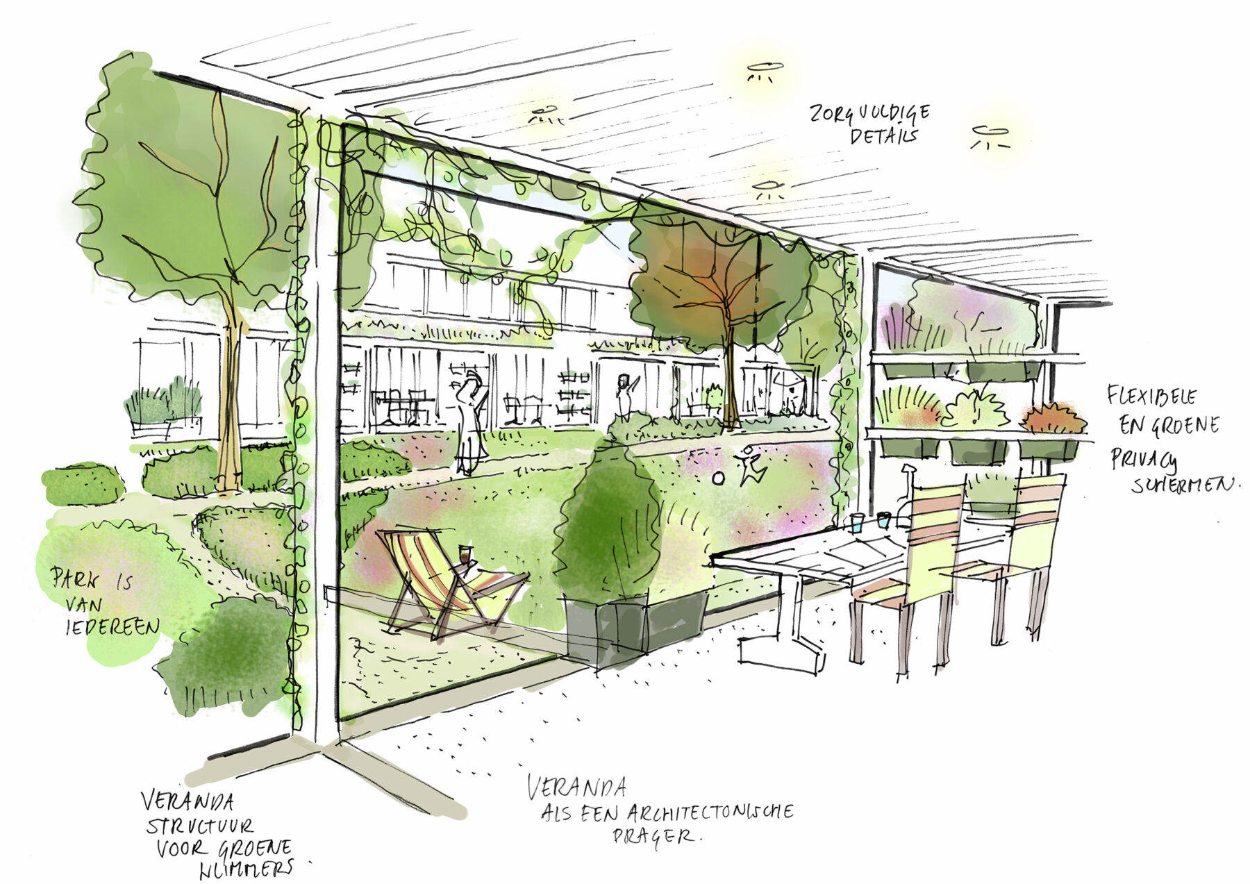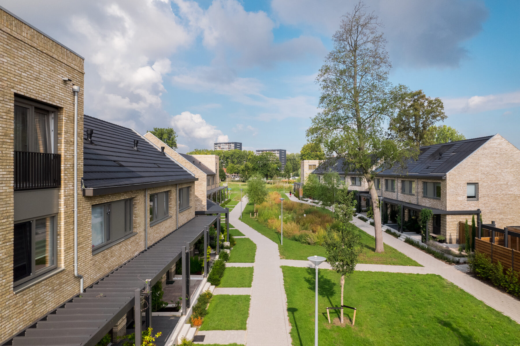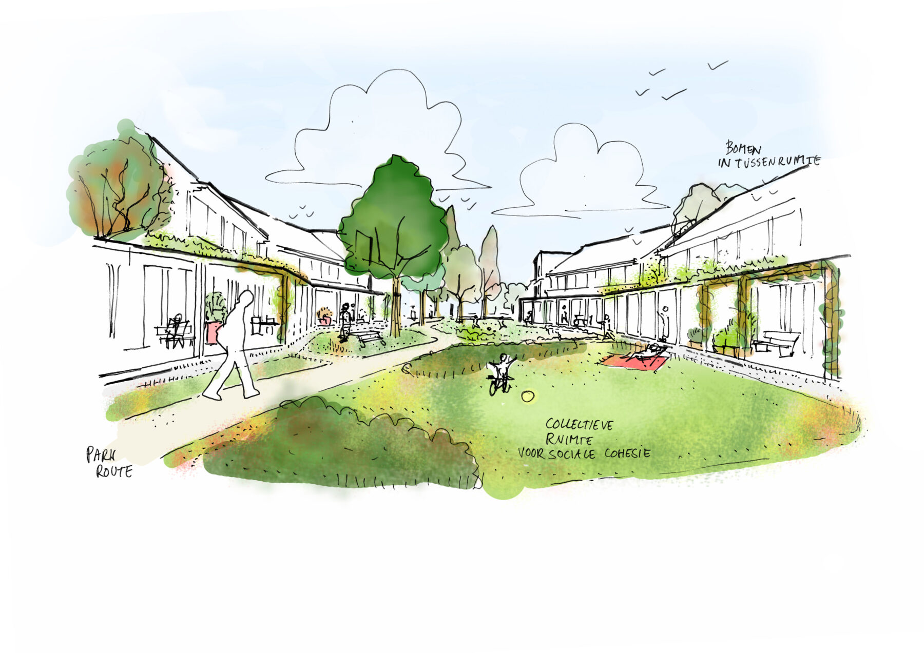 Het ontwerpen vanuit sociale domeinen en zorgvuldige aandacht voor overgangen zorgen hier daadwerkelijk voor meer contact, gevoel voor eigenaarschap, mogelijkheid tot ontmoeting en activiteit. Woningen zijn zo gepositioneerd dat de ogen zijn gericht op het park en daarmee wordt een sociaal veilige en prettige leefomgeving gecreëerd.