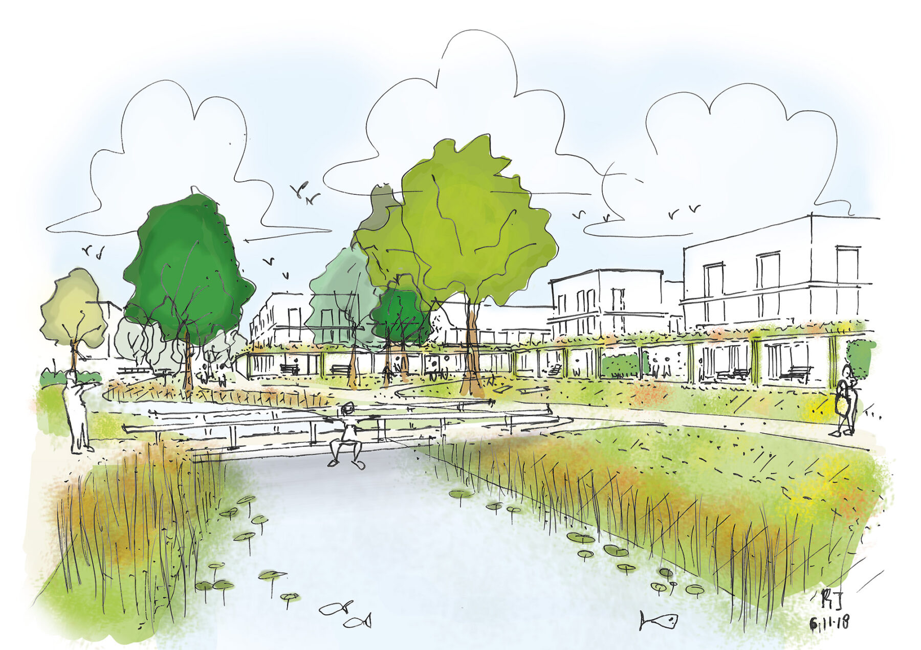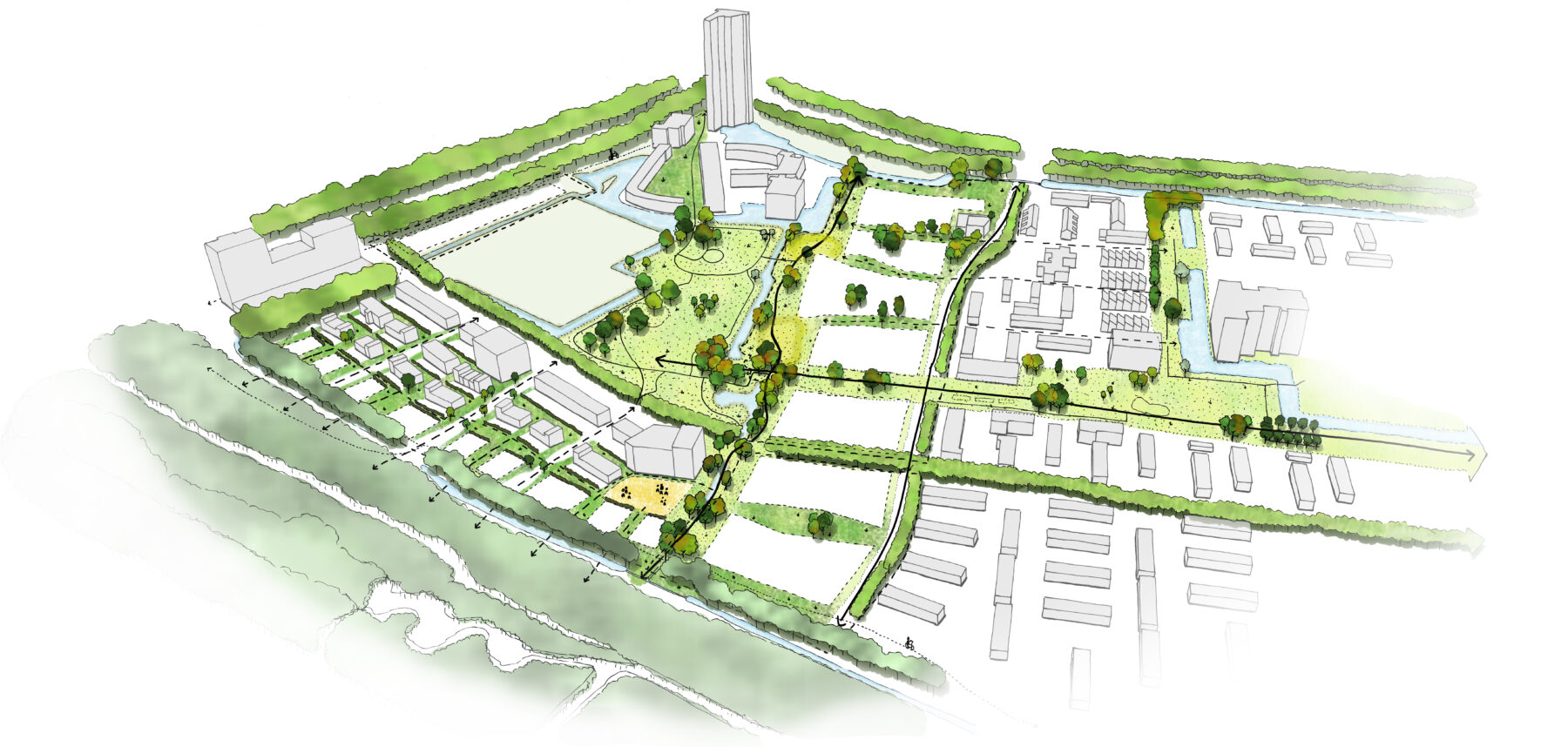– kruiden) voor voedsel, nestgelegenheid en beschutting voor de fauna. Het grote oppervlak openbaar groen in dit plan (circa 35%) maakt de buurt klimaatrobuust: het zorgt voor verkoeling, schaduw en infiltratie. Met behulp van ondergrondse water kratten wordt het water zoveel mogelijk in het park behouden. Regenwater loopt via de vaste plantenbakken naar openbaar groen en wadi’s.